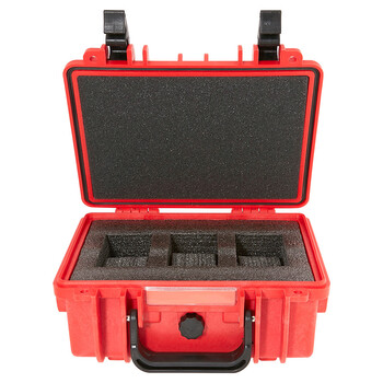 A Red Diver watch box featuring slots for three watches, two snap locking closures and a black handle. Dimensions: 25x22x12 cm