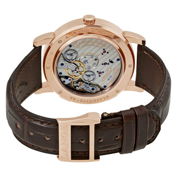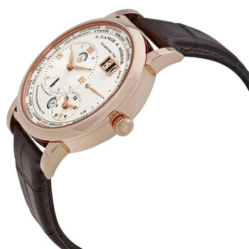 18kt rose gold case with a brown crocodile leather strap. Fixed 18kt rose gold bezel. Offset home time silver dial with rose gold alpha-style shape hands and index hour markers. Roman numerals mark the 3, 9 and 12 o'clock positions. minute markers. 24 world time cities around the outer rim. Dial Type: Analog. Date display at the 1 o'clock position. Second time zone, power reserve indicator, day/night indicator subdials. A. Lange & Sohne Calibre L031.1 hand wind movement with a 72-hour power reserve. Scratch resistant sapphire crystal. Pull / push crown. Transparent case back. Round case shape, case size: 41.9 mm, case thickness: 11 mm. Band width: 20 mm, band length: 8 inches. Tang clasp. Water resistant at 30 meters / 100 feet. Functions: world time, big date, GMT, second time zone, hour, minute, small second, power reserve indicator, day/night indicator. Additional Info: twin mainspring barrels, 21,600 vph, 54 jewels, 417 parts. Travel watch style. Watch label: Made in Germany. Item Variations: 116 032, 116-032, 116/032, 116032. A Lange and Sohne 1 Time Zone Silver Dial Mechanical Men's Watch 116032.