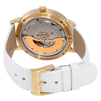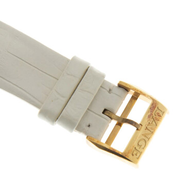 18kt yellow gold case with a white (alligator) leather strap. Fixed 18kt yellow gold bezel set with diamonds. Mother of pearl dial with gold-tone hands and index hour markers. Minute markers around the outer rim. Dial Type: Analog. Small seconds sub-dial. A. Lange & Sohne calibre L086.4 automatic movement, containing 31 Jewels, bitting at 21600 vph, and has a power reserve of approximately 72 hours. Scratch resistant sapphire crystal. Pull / push crown. Transparent case back. Round case shape. Case size: 37 mm. Tang clasp. Water resistant at 30 meters / 100 feet. Functions: hour, minute, second. Saxonia Series. Luxury watch style. Watch label: Made in Germany. A. Lange and Sohne Saxonia 18K Yellow Gold Diamond Automatic Ladies Watch 840.021.