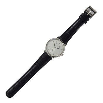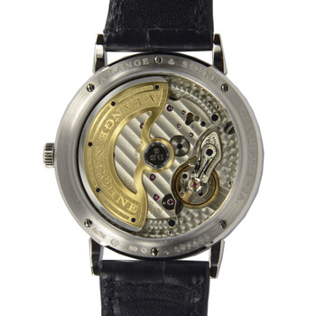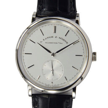 18kt white gold case with a black alligator leather strap. Fixed 18kt white gold bezel. Silver dial with silver-toned alpha-style shape hands and index hour markers. Minute markers around the outer rim. Dial Type: Analog. One subdial displaying: small second. A. Lange & Sohne Calibre L086.1 Automatic movement, containing 31 Jewels, composed of 209 parts, bitting at 21600 vph, and has a power reserve of approximately 72 hours. Scratch resistant sapphire crystal. Pull / push crown. Round case shape, case size: 38.5 mm, case thickness: 7.8 mm. Tang clasp. Water resistant at 30 meters / 100 feet. Functions: hour, minute, second. Saxonia Series. Luxury watch style. Watch label: Made in Germany. Item Variations: 380 026, 380-026, 380/026, 380026. A. Lange and Sohne Saxonia Silver Dial 18kt White Gold Automatic Men's Watch 380.026.