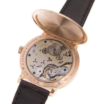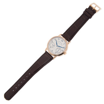 18kt rose gold case with a brown alligator leather strap. Fixed 18kt rose gold bezel. White dial with gold-tone alpha-style shape hands and Arabic numeral hour markers. Minute markers around the outer rim. Dial Type: Analog. Two - small second and power reserved indicator subdials. Hand wind movement with a 72-hour power reserve. Scratch resistant sapphire crystal. Screw down crown. Transparent case back. Round case shape. Case size: 39 mm. Tang clasp. Water resistant at 30 meters / 100 feet. Functions: hour, minute, small second, power reserved indicator. Additional Info: original box, international warranty card, manual (complete accessories). Luxury watch style. Watch label: Made in Germany. A. Lange Sohne 1815 18kt Rose Gold Men's Watch ALANGE234047.