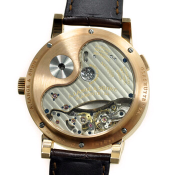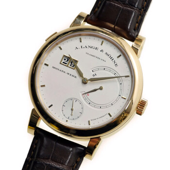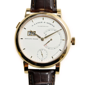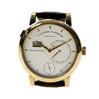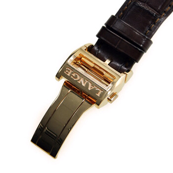 18kt rose gold case with a brown alligator band. Fixed 18kt rose gold bezel. Silver-tone dial with index hour markers. Dial Type: Analog. Two sub-dials displaying: small second and power reserve indicator. A. Lange & Sohne Calibre L034.1 Hand Wind movement, containing 62 Jewels, bitting at 21600 vph, and has a power reserve of approximately 744 hours. Scratch resistant sapphire crystal. Transparent see through case back. Round case shape, case size: 45.9 mm, case thickness: 15.9 mm. Deployment clasp. Water resistant at 30 meters / 100 feet. Functions: big date, hour, minute, small second, power reserve indicator. Lange 31 Series. Luxury watch style. Watch label: Made in Germany. A.Lange Sohne Lange 31 Hand Wind Silver Dial Men's Watch 130.032F.