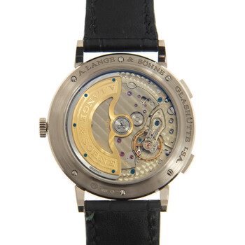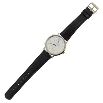 18kt white gold case with a black leather strap. Fixed silver-tone bezel. Silver-tone dial with index hour markers. Minute markers around the outer rim. Dial Type: Analog. Two sub-dials displaying: 60 second and 24 hour. A. Lange & Sohne Calibre L086.2 Automatic movement, containing 31 Jewels, bitting at 21600 vph, and has a power reserve of approximately 72 hours. Scratch resistant sapphire crystal. Screw down crown. Transparent see through case back. Round case shape, case size: 40 mm, case thickness: 9.1. Functions: GMT, second time zone, hour, minute, small second. Saxonia Dual Time Series. Luxury watch style. Watch label: Made in Germany. Item Variations: 385 026, 385-026, 385/026, 385026. A. Lange Sohne Saxonia Dual Time Automatic Silver Dial Men's Watch 385.026.