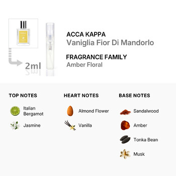 Crafted in Italy by Acca Kappa, a brand known for timeless quality and refined scents, this Eau de Parfum offers a delicate balance of sweetness and sophistication. Whether you're heading to a special event or simply want to add a touch of luxury to your everyday routine, Vaniglia Fior Di Mandorlo makes a graceful statement.