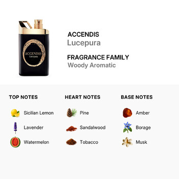 Discover a fragrance that captures the pure light of nature with Accendis Lucepura Eau de Parfum. Launched in 2017, this vibrant unisex scent blends fresh, woody, and warm notes to create a truly unforgettable experience. Perfect for day or night, Lucepura is a radiant expression of elegance and energy.