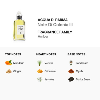 Experience the essence of victory, strength, and heroic adventures with Acqua Di Parma's Note Di Colonia III, a unique men's fragrance. Inspired by the musical overture of Triumphal March, this scent captures the spirit of courageous endeavors. It's an oriental fragrance that is fresh, spicy, sweet, smoky, warm, and sophisticated, making it a perfect companion for men who appreciate the finer things in life.