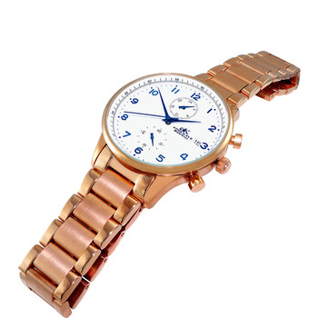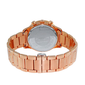 Rose gold-tone stainless steel case and bracelet. Fixed rose gold-tone stainless steel bezel. White dial with blue hands and Arabic numeral & index hour markers. Minute scale around the inner rim. Dial Type: Analog. Date display at the 3 o'clock position. 24 hour subdials. Quartz movement. Scratch resistant mineral crystal. Pull / push crown. Solid case back. Round case shape, case size: 41 mm, case thickness: 12.75 mm. Band width: 20 mm, band length: 7.75 inches. Fold over with double push button release clasp. Water resistant at 50 meters / 165 feet. Functions: date, hour, minute, second. Ak7501-m Series. Casual watch style. Watch label: Japan Movt. Adee Kaye AK7501-M Quartz White Dial Men's Watch AK7501-MRGWT.