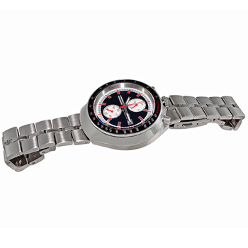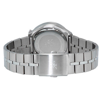 Silver-tone stainless steel case and bracelet. Fixed black aluminum bezel. Black dial with silver-tone hands and index hour markers. Minute scale around the inner rim. Dial Type: Analog. Luminescent hands. Date display at the 3 o'clock position. Chronograph - two sub-dials displaying: 60 small seconds, 24 hour. Miyota Caliber OS20 quartz movement. Scratch resistant mineral crystal. Pull / push crown. Solid case back. Round case shape, case size: 44 mm, case thickness: 13.75 mm. Band width: 20 mm, band length: 7.25 inches. Fold over with double push button release clasp. Water resistant at 50 meters / 165 feet. Functions: chronograph, date, hour, minute, second, tachymeter. Ak5562 Series. Dress watch style. Watch label: Japan Movt. Adee Kaye Chronograph Quartz Black Dial Men's Watch AK5562-MBK.