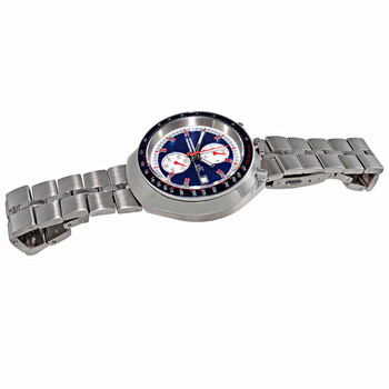 Silver-tone stainless steel case and bracelet. Fixed blue aluminum bezel. Blue dial with silver-tone hands and index hour markers. Minute scale around the inner rim. Dial Type: Analog. Luminescent hands. Date display at the 3 o'clock position. Chronograph - two sub-dials displaying: 60 small seconds, 24 hour. OS20 MIYOTA quartz movement. Scratch resistant mineral crystal. Pull / push crown. Solid case back. Round case shape, case size: 44 mm, case thickness: 13.75 mm. Band width: 20 mm, band length: 7.25 inches. Fold over with double push button release clasp. Water resistant at 50 meters / 165 feet. Functions: chronograph, date, hour, minute, second, tachymeter. Ak5562 Series. Dress watch style. Watch label: Japan Movt. Adee Kaye Chronograph Quartz Blue Dial Men's Watch AK5562-MBU.