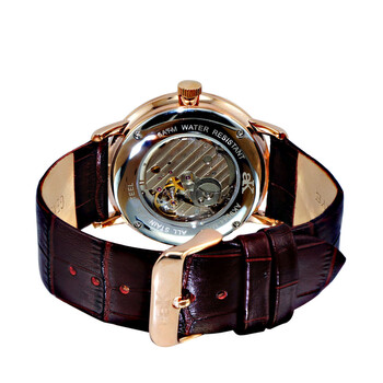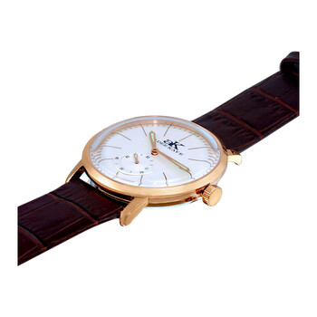 Rose gold-tone stainless steel case with a brown genuine leather strap. Fixed rose gold-tone stainless steel bezel. White dial with rose gold-tone sword-shaped hands and index hour markers. Minute scale around the inner rim. Dial Type: Analog. Luminescent hands and markers. One subdial displaying: 60 small seconds. TY2705 hand wind movement. Scratch resistant mineral crystal. Pull / push crown. Transparent case back. Round case shape, case size: 42 mm, case thickness: 11 mm. Band width: 21 mm, band length: 7.5 inches. Buckle clasp. Water resistant at 50 meters / 165 feet. Functions: hour, minute, second. Akj9044 Series. Casual watch style. Adee Kaye AKJ9044 Hand Wind White Dial Men's Watch AK9044-MRGWT.