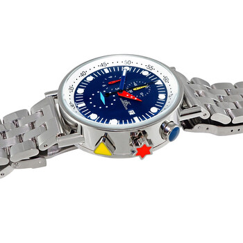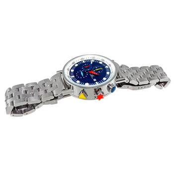 Stainless steel case with a stainless steel bracelet. Fixed stainless steel bezel. Blue dial with red and blue hands and dot hour markers. Minute markers around the outer rim. Dial Type: Analog. Luminescent hands and markers. Date display at the 3 o'clock position. Chronograph - three sub-dials displaying: 60 second, 60 minute and 12 hour. Miyota caliber OS10 quartz movement. Scratch resistant mineral crystal. Pull / push crown. Solid case back. Round case shape. Case size: 45 mm. Case thickness: 16 mm. Band width: 22 mm. Band length: 6.5 inches. Fold over clasp. Water resistant at 50 meters / 165 feet. Functions: date, hour, minute, second. Casual watch style. Watch label: Japan Movt. Adee Kaye Quartz Blue Dial Men's Watch AK2268SS-20.