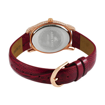 Rose gold-tone brass case with a red leather strap. Fixed rose gold-tone brass bezel set with crystals. Crystal-set lugs. White (crystal-set) dial with black dauphine-style hands. No markers. Dial Type: Analog. Small seconds sub-dial. Miyota 1L40 quartz movement. Scratch resistant mineral crystal. Pull / push crown. Solid case back. Oval case shape. Case size: 32.5 mm. Case thickness: 9.75 mm. Band width: 16 mm. Band length: 7 inches. Tang clasp. Water resistant at 30 meters / 100 feet. Functions: hour, minute, second. Akj2003-l Series. Casual watch style. Watch label: Japan Movt. Adee Kaye Quartz Crystal White Dial Ladies Watch AK2003-LRG.