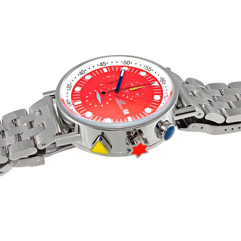 Stainless steel case with a stainless steel bracelet. Fixed stainless steel bezel. Red dial with red and blue hands and dot hour markers. Minute markers. Arabic numeral minute markers (at 5 minute intervals) around the outer rim. Dial Type: Analog. Luminescent hands and markers. Date display at the 3 o'clock position. Chronograph - three sub-dials displaying: 60 second, 60 minute and 12 hour. Miyota caliber OS10 quartz movement. Scratch resistant mineral crystal. Pull / push crown. Solid case back. Round case shape. Case size: 45 mm. Case thickness: 16 mm. Band width: 22 mm. Band length: 6.5 inches. Fold over clasp. Water resistant at 50 meters / 165 feet. Functions: date, hour, minute, second. Casual watch style. Watch label: Japan Movt. Adee Kaye Quartz Red Dial Men's Watch AK2268SS-40.