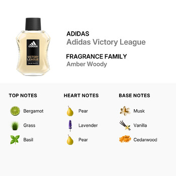 Step into confidence with Adidas Victory League Eau de Toilette Spray for Men. Launched in 2006, this bold amber woody fragrance is designed for winners. Its fresh top notes of bergamot, green grass, and basil spark energy and drive. At the heart, warm hints of lavender and juicy pear add a smooth, modern touch. Finally, rich base notes of musk, vanilla, and cedarwood create a lasting impression full of strength and style.