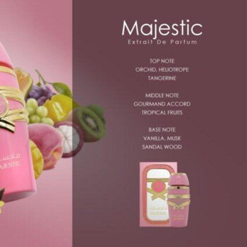 The fragrance finishes with a comforting base of creamy vanilla, smooth sandalwood, and soft musk, leaving a lasting impression that’s both elegant and empowering. This expertly balanced composition makes Majestic perfect for day or night wear, adding a touch of luxury to every occasion.