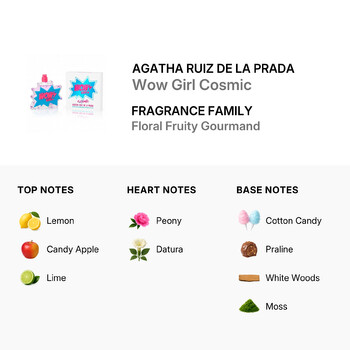 Step into a universe of sparkle and scent with Wow Girl Cosmic Eau de Toilette by Agatha Ruiz De La Prada. Launched in 2019, this ladies’ fragrance is a playful blend of floral, fruity, and sweet gourmand notes that ignite your senses and brighten your day. Made in Spain by the iconic designer Agatha Ruiz De La Prada, this scent captures the bold spirit of young women who love to stand out and shine.