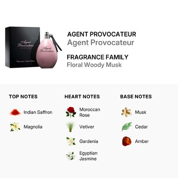 Agent Provocateur opens with a bold yet delicate blend of Indian saffron and fresh magnolia. As the fragrance unfolds, the heart reveals an alluring bouquet of Moroccan rose, gardenia, Egyptian jasmine, and earthy vetiver—each note adding depth and grace. The base lingers with a sensual mix of rich musk, warm amber, and smooth cedarwood, leaving a lasting impression wherever you go.