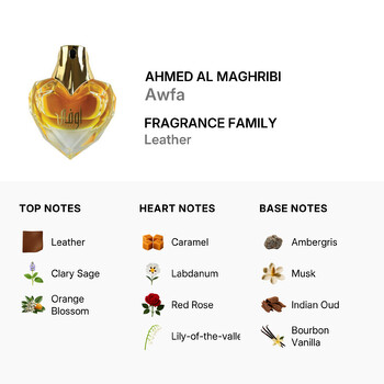 Awfa opens with a striking blend of leather, clary sage, and a hint of orange blossom, delivering a confident, modern edge. As the fragrance unfolds, indulgent notes of caramel, labdanum, red rose, and the delicate touch of lily-of-the-valley add warmth and mystery. The base is deep and long-lasting, featuring a luxurious mix of ambergris, musk, Indian oud, bourbon vanilla, oakmoss, and Haitian vetiver.
