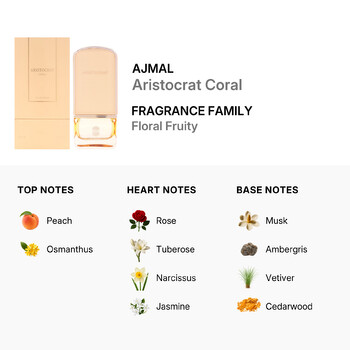 Aristocrat Coral belongs to the enchanting Floral Fruity fragrance family. It opens with a juicy burst of peach and the soft sweetness of osmanthus, creating a fresh and inviting introduction. As the scent unfolds, a lush bouquet of rose, tuberose, narcissus, jasmine, and geranium blooms at its heart—delivering a romantic and captivating experience that lingers throughout the day.