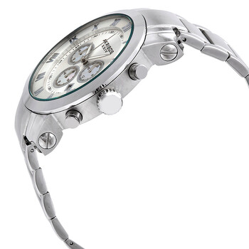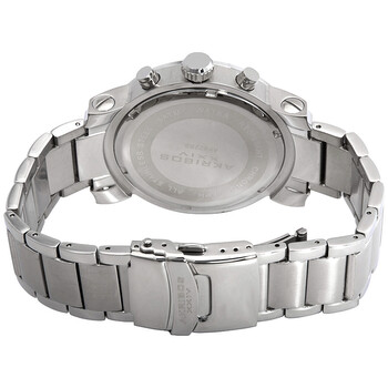 Stainless steel case with a stainless steel bracelet. Fixed stainless steel bezel. Silver sunray dial with luminous silver-tone hands and Roman numeral hour markers. Minute markers around an inner ring. Dial Type: Analog. Luminescent hands. Chronograph - three sub-dials displaying: 60 second, 60 minute and 24 hour. Japanese quartz movement. Scratch resistant mineral crystal with a sapphire coating. Pull / push crown. Screw down case back. Case diameter: 47 mm. Case thickness: 11 mm. Round case shape. Band width: 24 mm. Band length: 8.5 inches. Push-button deployment clasp. Water resistant at 50 meters / 165 feet. Functions: hour, minute, second. Dress watch style. Akribos Grandiose Chronograph Silver Dial Stainless Steel Men's Watch AK622SS.