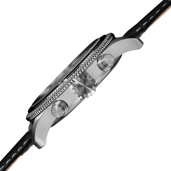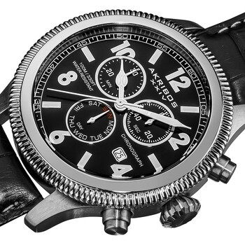 Stainless steel case with a black leather strap. Fixed stainless steel bezel. Black sunray dial with silver-tone hands and alternating stick and Arabic numeral hour markers. Arabic numeral minute markers (at 5 minute intervals). Minute markers around the outer rim. Dial Type: Analog. Luminescent hands and markers. Date display at the 4 o'clock position, Day of the week sub-dial. Chronograph - two sub-dials displaying: 60 second and 30 minute. Swiss quartz movement. Scratch resistant mineral crystal. Pull / push crown. Solid case back. Case diameter: 44 mm. Case thickness: 11 mm. Round case shape. Band width: 20 mm. Band length: 9 inches. Tang clasp. Water resistant at 100 meters / 330 feet. Functions: chronograph, day, date, hour, minute, second. Casual watch style. Akribos Ultimate Chronograph Stainless Steel Men's Watch AK575BK.