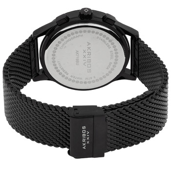 Black-plated stainless steel case with a black-plated stainless steel mesh bracelet. Fixed black-plated bezel. Blue (etched pattern) dial with luminous grey hands and index hour markers. Arabic numerals appear at the4, 8 and 12 o'clock positions. Tachymeter markers around the outer rim. Dial Type: Analog. Luminescent hands. Date display between the 4 and 5 o'clock positions. Chronograph - two sub-dials displaying: 60 second and 30 minute. Date sub-dial. Quartz movement. Scratch resistant mineral crystal. Pull / push crown. Snap down case back. Round case shape. Case size: 42.5 mm. Case thickness: 11 mm. Band width: 22 mm. Band length: 9 inches. Fold over slip through clasp. Water resistant at 30 meters / 100 feet. Functions: date, hour, minute, second, tachymeter. Casual watch style. Watch label: Hong Kong. Akribos XXIV Blue Dial Black-plated Mesh Men's Watch AK719BU.
