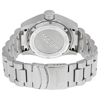 Stainless steel case with a stainless steel bracelet. Fixed stainless steel bezel. Matte blue dial with luminous silver-tone hands and dot hour markers. Minute markers around the outer rim. Dial Type: Analog. Luminescent hands and hour markers. Date display at 3 o'clock position. Quartz movement. Scratch resistant mineral crystal with sapphire coating. Pull / push crown. Solid case back. Case diameter: 47 mm. Case thickness: 25 mm. Round case shape. Band width: 25 mm. Band length: 9 inches. Fold over clasp with a safety release. Water resistant at 1000 meters / 3300 feet. Functions: date, hour, minute, second. Sport watch style. Watch label: Hong Kong. Akribos XXIV Blue Dial Stainless Steel Men's Watch AK730BU.