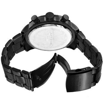 Black PVD alloy case and bracelet. Uni-directional rotating black PVD alloy (count-up elapsed time) top ring bezel. Black dial with luminous silver-tone hands and alternating Arabic numeral and index hour markers. Arabic numeral minute markers (at 10 minute intervals). Minute markers around the outer rim. Dial Type: Analog. Luminescent hands and markers. Chronograph - four sub-dials displaying: 1/10th second, 60 second, 60 minute and 24 hour. Quartz movement. Scratch resistant sapphire-coated mineral crystal. Pull / push crown. Solid case back. Round case shape. Case size: 49.5 mm. Case thickness: 13.5 mm. Band width: 25 mm. Push-button deployment clasp. Water resistant at 10 meters / 33 feet. Functions: chronograph, hour, minute, second. Casual watch style. Watch label: Japan Movt. Akribos XXIV Chronograph Black Dial Men's Watch AK814BK.