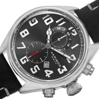 Stainless steel case with a black leather strap. Fixed stainless steel bezel. Black matte dial with luminous silver-tone hands and Arabic numeral hour markers. Minute markers around the outer rim. Dial Type: Analog. Luminescent hands and hour markers. Date display at 4 o'clock position. Chronograph - two sub-dials displaying: 60 second and 30 minute. Quartz movement. Scratch resistant mineral crystal with sapphire coating. Pull / push crown. Screw down case back. Case diameter: 46 mm. Case thickness: 14.5 mm. Round case shape. Band width: 24 mm. Band length: 9 inches. Tang clasp. Water resistant at 50 meters / 165 feet. Functions: chronograph, date, hour, minute, second. Casual watch style. Watch label: Hong Kong. Akribos XXIV Essential Chronograph Black Dial Stainless Steel Men's Watch AK706SSB.
