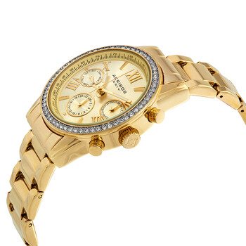 Yellow gold-tone alloy case with a yellow gold-tone stainless steel bracelet. Fixed yellow gold-tone alloy bezel set with crystals. Gold dial with gold-tone hands and alternating Roman numeral and index hour markers. Minute markers. Tachymeter markings around the outer rim. Dial Type: Analog. Luminescent hands. Date display at the 3 o'clock position. Three sub-dials displaying: 24 hour, date and day of the week. Quartz movement. Scratch resistant mineral crystal. Pull / push crown. Solid case back. Round case shape. Case size: 36 mm. Case thickness: 11 mm. Band width: 18 mm. Deployment clasp with a push button release. Water resistant at 30 meters / 100 feet. Functions: date, day, hour, minute, second, tachymeter. Casual watch style. Akribos XXIV Glimmer Gold Tone Dial Ladies Multifunction Watch AK872YG.