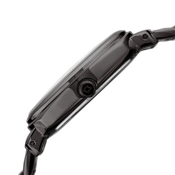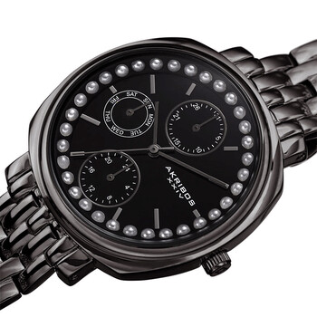 Black-plated composite metal case with a gunmetal-plated stainless steel bracelet. Fixed black-plated composite metal bezel. Black dial (with pearlescent half spheres around the outer rim) with black hands and index hour markers. Dial Type: Analog. Three multi-function sub-dials displaying: 24 hours, date and day of the week. Quartz movement. Scratch resistant Hardlex crystal. Pull / push crown. Solid case back. Cushion case shape. Case size: 36 mm. Case thickness: 8.5 mm. Band width: 14 mm. Fold over clasp with a push button release. Water resistant at 30 meters / 100 feet. Functions: date, day, hour, minute, second. Casual watch style. Akribos XXIV Quartz Black Dial Ladies Watch AK1114GN.