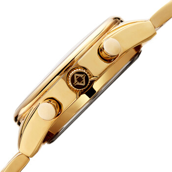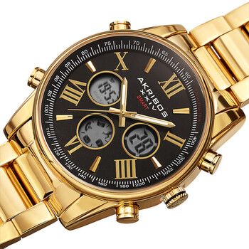 Yellow gold-tone composite metal case with a yellow gold-tone stainless steel bracelet. Fixed gold-tone composite metal bezel. Black dial with luminous yellow gold-tone hands and alternating Roman numeral & index hour markers. Tachymeter scale around the outer rim. Dial Type: Analog-digital. Luminescent hands. Digital calendar. Quartz movement. Scratch resistant Hardlex crystal. Pull / push crown. Solid case back. Round case shape. Case size: 45 mm. Case thickness: 14.5 mm. Band width: 24 mm. Band length: 8.5 inches. Hidden clasp. Water resistant at 30 meters / 100 feet. Functions: date, hour, minute, second, tachymeter. Sport watch style. Watch label: Made in China. Akribos XXIV Quartz Black Dial Men's Smart Watch AK1095YGBK.