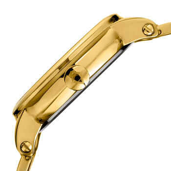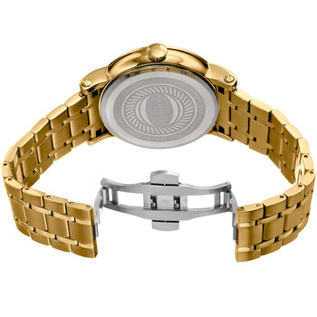 Yellow gold-tone composite metal case with a yellow gold-tone stainless steel bracelet. Fixed yellow gold-tone composite metal bezel. Black guilloche dial with yellow gold-tone Breguet-style hands and Roman numeral hour markers. Minute markers around the outer rim. Dial Type: Analog. Three displays showing: retrograde date, retrograde day of the week and 24 hour. Quartz movement. Scratch resistant mineral crystal. Pumpkin style pull / push crown. Solid case back. Round case shape. Case size: 46 mm. Case thickness: 12.5 mm. Band width: 22 mm. Band length: 8 inches. Butterfly clasp. Water resistant at 30 meters / 100 feet. Functions: date, day, hour, minute, second, retrograde. Fashion watch style. Akribos XXIV Quartz Black Dial Men's Watch AK1001YGB.
