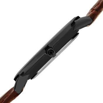 Black-plated stainless steel case with a brown leather strap. Fixed black-plated bezel. Black dial with silver-tone hands and Arabic numeral hour markers. Dial Type: Analog. Date display above the 6 o'clock position. Quartz movement. Scratch resistant mineral crystal. Pull / push crown. Solid case back. Round case shape. Case size: 38 mm. Case thickness: 8.4 mm. Band width: 18 mm. Band length: 8.5 inches. Tang clasp. Water resistant at 30 meters / 100 feet. Functions: date, hour, minute, second. Fashion watch style. Akribos XXIV Quartz Black Dial Men's Watch AK1077BK.