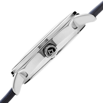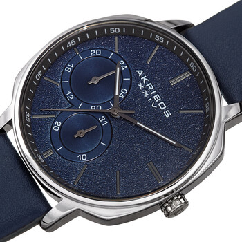 Silver-tone composite metal case with a blue leather strap. Fixed silver-tone composite metal bezel. Blue dial with luminous grey pencil-style hands and index hour markers. Minute markers around the outer rim. Dial Type: Analog. Luminescent hands. Two sub-dials displaying: day of the week and 24 hour. Quartz movement. Scratch resistant mineral crystal. Pull / push crown. Solid case back. Cushion case shape. Case size: 42 mm. Case thickness: 11 mm. Band width: 20 mm, band length: 8 inches. Tang clasp. Water resistant at 30 meters / 100 feet. Functions: GMT, second time zone, date, hour, minute, second. Fashion watch style. Akribos XXIV Quartz Blue Dial Blue Leather Men's Watch AK1022BU.