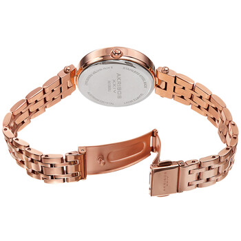Rose gold-tone composite metal case with a rose gold-tone stainless steel bracelet. Fixed rose gold-tone bezel. Blue dial with rose gold-tone pancil-style hands and Swarovski crystal hour markers. Dial Type: Analog. Quartz movement. Scratch resistant mineral crystal. Pull / push crown. Solid case back. Round case shape. Case size: 32 mm. Case thickness: 7.5 mm. Band width: 14 mm, band length: 8 inches. Fold over clasp. Water resistant at 30 meters / 100 feet. Functions: hour, minute. Fashion watch style. Akribos XXIV Quartz Crystal Blue Dial Ladies Watch AK1085BU.