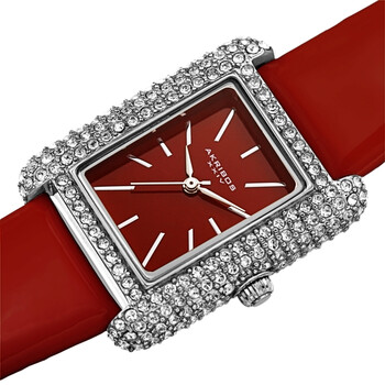Silver-tone brass case set (all over) with Swarovski crystals with a red leather strap. Fixed silver-tone brass bezel set with Swarovski crystals. Red dial with silver-tone alpha-style hands and index hour markers. Dial Type: Analog. Quartz movement. Scratch resistant mineral crystal. Pull / push crown. Solid case back. Rectangle case shape. Case size: 27 mm x 35 mm. Case thickness: 8 mm. Band width: 18 mm. Band length: 7.5 inches. Tang clasp. Water resistant at 30 meters / 100 feet. Functions: hour, minute, second. Fashion watch style. Akribos XXIV Quartz Crystal Red Dial Red Leather Ladies Watch AK1068RD.
