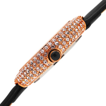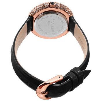 Rose gold-tone brass case with a black leather strap. Fixed rose gold-tone swarovski crystal set bezel. White dial with rose gold-tone hands. Dial Type: Analog. Quartz movement. Scratch resistant mineral crystal. Pull / push crown. Solid case back. Round case shape, case size: 36 mm, case thickness: 8.2 mm. Band width: 14 mm, band length: 7 inches. Buckle clasp. Water resistant at 30 meters / 100 feet. Functions: hour, minute. Fashion watch style. Akribos XXIV Quartz Crystal White Dial Ladies Watch AK1049BKR.
