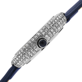 Silver-tone brass case with a blue leather strap. Fixed silver-tone swarovski crystal set bezel. White dial with silver-tone hands. Dial Type: Analog. Quartz movement. Scratch resistant mineral crystal. Pull / push crown. Solid case back. Round case shape, case size: 36 mm, case thickness: 8.2 mm. Band width: 14 mm, band length: 7 inches. Buckle clasp. Water resistant at 30 meters / 100 feet. Functions: hour, minute. Fashion watch style. Akribos XXIV Quartz Crystal White Dial Ladies Watch AK1049BU.