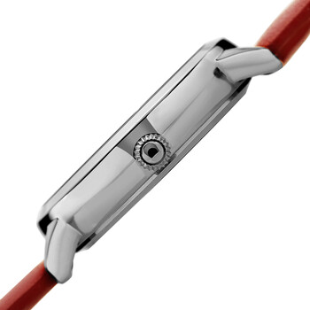 Silver-tone composite metal case with a red leather strap. Fixed silver-tone composite metal bezel. Silver dial with silver-tone leaf-style hands. Diamonds set at the 3, 6, 9 and 12 o'clock positions. Dial Type: Analog. Quartz movement. Scratch resistant mineral crystal. Pull / push crown. Solid case back. Round case shape. Case size: 34 mm. Case thickness: 8.5 mm. Band width: 14 mm. Band length: 7.5 inches. Tang clasp. Water resistant at 30 meters / 100 feet. Functions: hour, minute. Fashion watch style. Akribos XXIV Quartz Diamond Silver Dial Ladies Watch AK1051RD.