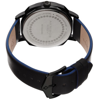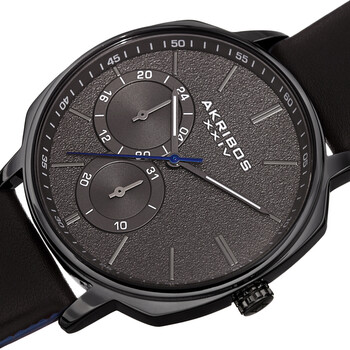 Black-plated composite metal case with a black leather strap. Fixed black-plated composite metal bezel. Grey dial with luminous black pencil-style hands and index hour markers. Minute markers around the outer rim. Dial Type: Analog. Luminescent hands. Date display at the 6 o'clock position. Two sub-dials displaying: 24 hour and date. Quartz movement. Scratch resistant mineral crystal. Pull / push crown. Solid case back. Cushion case shape. Case size: 42 mm. Case thickness: 11 mm. Band width: 20 mm. Band length: 8 inches. Tang clasp. Water resistant at 30 meters / 100 feet. Functions: date, GMT, second time zone, hour, minute, second. Fashion watch style. Akribos XXIV Quartz Grey Dial Black Leather Men's Watch AK1022BK.