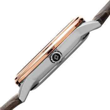 Silver-tone composite metal case with a charcoal (python embossed) leather strap. Fixed rose gold-tone bezel. Grey dial with rose gold-tone hands and Swarovski crystal hour markers. Dial Type: Analog. Quartz movement. Scratch resistant Hardlex crystal. Pull / push crown. Solid case back. Round case shape. Case size: 35 mm. Case thickness: 7 mm. Band width: 16 mm. Tang clasp. Water resistant at 30 meters / 100 feet. Functions: hour, minute, second. Casual watch style. Akribos XXIV Quartz Grey Dial Ladies Watch AK1115TTR.