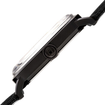 Black composite metal case with a black leather strap. Fixed black composite metal bezel. Silver dial with luminous black pencil-style hands and Arabic numeral hour markers. Arabic numeral minute markers (at 5 minute intervals). Minute markers around the outer rim. Dial Type: Analog. Luminescent hands and markers. Date display bove the 6 o'clock position. Quartz movement. Scratch resistant acrylic crystal. Pull / push crown. Solid case back. Round case shape. Case size: 41 mm. Case thickness: 11 mm. Band width: 20 mm. Band length: 7.5 inches. Tang clasp. Water resistant at 10 meters / 33 feet. Functions: date, hour, minute, second. Fashion watch style. Akribos XXIV Quartz Silver Dial Men's Watch AK1025BK.