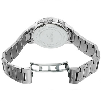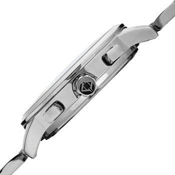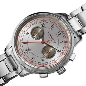 Silver-tone composite metal case with a stainless steel bracelet. Fixed silver-tone composite metal bezel. Silver dial with black hands and Arabic numeral hour markers. Minute markers. 24 hour markers around the outer rim. Dial Type: Analog. Date display above the 6 o'clock position. Two sub-dials displaying: 24 hour and 24 hour. Quartz movement. Scratch resistant mineral crystal. Pull / push crown. Solid case back. Rectangle case shape. Case size: 43 mm. Case thickness: 11.5 mm. Band width: 18 mm. Band length: 8.5 inches. Butterfly clasp. Water resistant at 30 meters / 100 feet. Functions: dual time, GMT, date, hour, minute, second. Fashion watch style. Akribos XXIV Quartz Silver Dial Men's Watch AK1071SS.