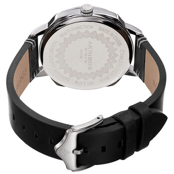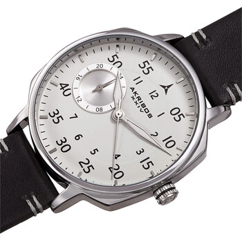 Silver-tone composite metal case with a black leather strap. Fixed silver-tone composite metal bezel. White dial with luminous silver-tone hands and index / Arabic numeral hour markers. Arabic numeral minute markers (at 5 minute intervals). Minute markers around the outer rim. Dial Type: Analog. Luminescent hands. 24 hour subdials. Quartz movement. Scratch resistant Hardlex crystal. Pull / push crown. Solid case back. Cushion case shape. Case size: 42 mm. Case thickness: 9.5 mm. Band width: 20 mm. Tang clasp. Water resistant at 30 meters / 100 feet. Functions: hour, minute, second. Casual watch style. Akribos XXIV Quartz White Dial Black Leather Men's Watch AK1109SS.