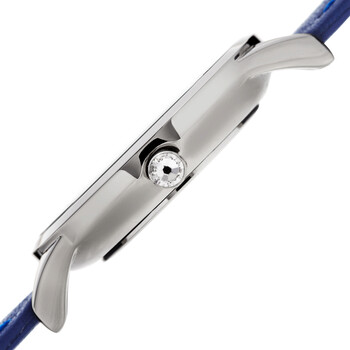 Silver-tone composite metal case with a blue leather strap. Fixed silver-tone composite metal bezel. White dial with silver-tone pencil-style hands. No markers. Dial Type: Analog. Quartz movement. Scratch resistant mineral crystal. Pull / push crown. Solid case back. Round case shape. Case size: 35 mm. Case thickness: 8.7 mm. Band width: 14 mm. Band length: 7.75 inches. Tang clasp. Water resistant at 30 meters / 100 feet. Functions: hour, minute, second. Fashion watch style. Akribos XXIV Quartz White Dial Blue Leather Ladies Watch AK1005BU.