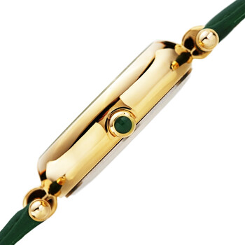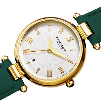 Gold-tone composite metal case with a green leather strap. Fixed gold-tone composite metal bezel. White dial with gold-tone leaf-style hands and Roman numeral hour markers. Dial Type: Analog. Date display above the 6 o'clock position. Quartz movement. Scratch resistant mineral crystal. Pull / push crown. Solid case back. Round case shape. Case size: 35 mm. Case thickness: 8.8 mm. Band width: 16 mm. Band length: 7.5 inches. Tang clasp. Water resistant at 30 meters / 100 feet. Functions: date, hour, minute, second. Fashion watch style. Akribos XXIV Quartz White Dial Green Leather Ladies Watch AK1070GN.