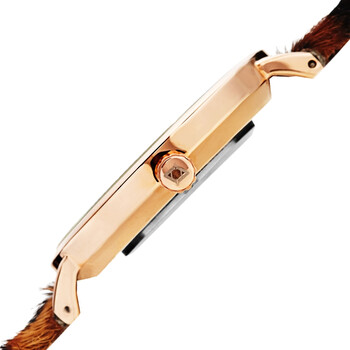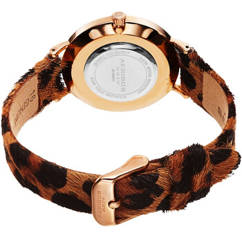 Rose gold-tone composite metal case with a animal print cavallino (hair-on-hide) leather strap. Fixed rose gold-tone composite metal bezel. White dial with rose gold-tone hands and Roman numeral hour markers. Minute markers around the outer rim. Dial Type: Analog. Quartz movement. Scratch resistant mineral crystal. Pull / push crown. Solid case back. Round case shape. Case size: 36 mm. Case thickness: 7 mm. Band width: 16 mm. Band length: 7.5 inches. Tang clasp. Water resistant at 30 meters / 100 feet. Functions: hour, minute, second. Fashion watch style. Akribos XXIV Quartz White Dial Ladies Watch AK1080RG.
