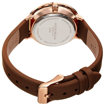 Rose gold-tone stainless steel case with a brown satin strap. Fixed rose gold-tone stainless s bezel set with Swarovski crystals. White dial with luminous rose gold-tone leaf-style hands. No markers. Dial Type: Analog. Luminescent hands. Quartz movement. Scratch resistant Hardlex crystal. Pull / push crown. Solid case back. Round case shape. Case size: 34 mm. Case thickness: 9 mm. Band width: 14 mm. Band length: 7 inches. Tang clasp. Water resistant at 30 meters / 100 feet. Functions: hour, minute. Fashion watch style. Akribos XXIV Quartz White Dial Ladies Watch AK1093BR.