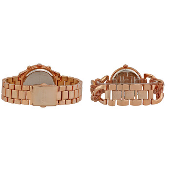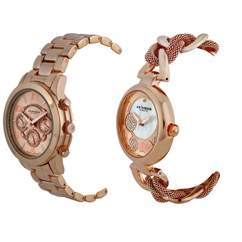 Rose gold tone stainless steel case with a rose gold tone stainless steel bracelet. Fixed bezel. AK648: rose gold tone dial AK643: mother of pearl center dial with diamonds. Luminous hands and AK648: alternating Arabic and index hour markers. Dial Type: Analog. Three - day of the week, date and 24 hour. Quartz movement. Scratch resistant mineral crystal. Pull / push crown. Case diameter: 40 mm. Round case shape. Water resistant at 10 meters / 33 feet. Functions: hour, minute, second, calendar, 24 hour . Additional Info: AK648: deployant clasp with push buttons. AK643: jewelry clasp. Dress watch style. Akribos XXIV Watch Set AK676RG.